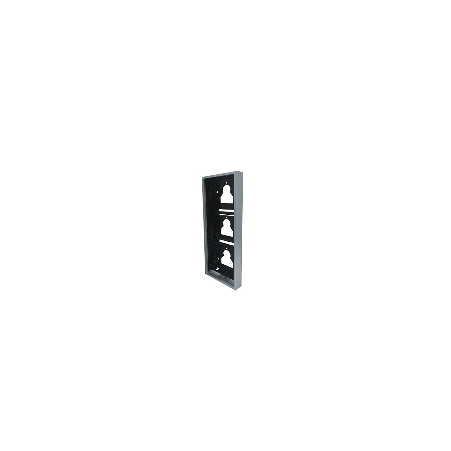 Custodia da parete 3 moduli per pulsantiera Ultra, colore silver RAL9006. E' composta dal supporto metallico che permette di fissare saldamente i moduli senza l'utilizzo di viti e da una cornice realizzata in pressofusione di alluminio trattata per cataforesi per aumentare la resistenza ai processi di corrosione chimica e ambientale, compresi i raggi UV. Sporgenza dalla parete di soli 35 mm. Dimensioni (L x H x P): 110 x 289 x 35mm.
