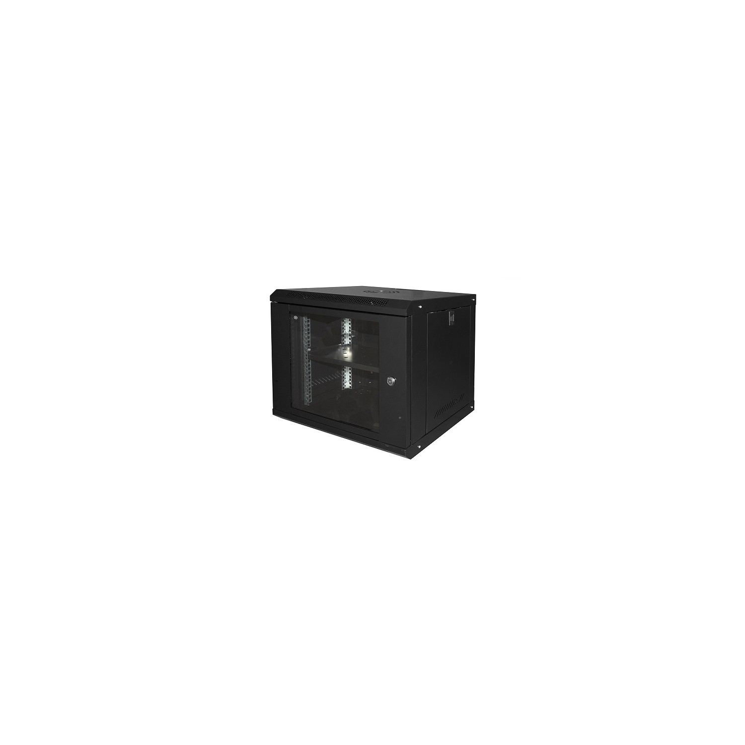 Questi armadi rack 19'' per installazione a muro sono ideali per uso home e piccoli uffici, per telecomunicazioni, e per dispositivi di rete. In lamiera 0.8 mm, è un armadio rack leggero, facile da trasportare e adatto per installazione di dispositivi fino a un massimo di 30 kg.È una soluzione economica per supportare dispositivi come router, pannelli patch, multiprese.Non è adatto a per supportare gruppi di continuità o altri dispositivi pesanti.- Gli armadi vengono spediti già montati.- Fianchi laterali apribili con chiusura a scatto.- Porta frontale in vetro temprato, chiusura a chiave.La porta si può aprire di 180°, reversibile, si può installare in modo da essere aperta da entrambi i lati.- Con 4 montanti laterali verticali da 19'' regolabili in profondità.- Un ripiano incluso profondità cm 19.- Capacità di carico 30 Kg.- Feritoie sagomate per ingresso cavi dall'alto o dal basso, e da dietro.- Fori sul tetto per ventilazione passiva o installazione ventole.- Tasselli per installazione a muro non inclusi. - Colore nero RAL703.